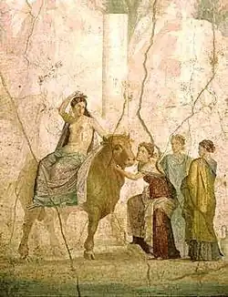 Nach der griechischen Mythologie war Eurṓpē eine phönizische Königstochter, die der in Stiergestalt auftretende Gott Zeus schwimmend auf seinem Rücken nach Kreta entführte. Nach Auffassung der Sprachwissenschaften stammt der Name aus dem Semitischen und wurde gräzisiert. Phonetisch naheliegend ist demnach die Herkunft vom akkadischen oder phönizischen Wort (ʕ)erebu bzw. (ʕ)arab „untergehen“ (bezogen auf die Sonne) sowie dem davon abgeleiteten phönizischen ʕerob „Abend, Westen“ (zur Assoziation des Abends mit der Himmelsrichtung vgl. Abendland sowie das arabische Maghreb, dem dieselbe semitische Wortwurzel zugrunde liegt wie offenbar Europa, nämlich ʕrb bzw. ġrb „vorübergehen“; zum ins Griechische nicht übernommenen semitischen Kehllaut am Anfang vgl. ʕ und ġ).[2]