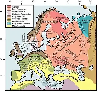 Das präkambrische Nordosteuropa besteht aus Resten der Kontinente Baltica im Osten und Laurentia im Nordwesten sowie dem südwestlich davon liegenden Kleinkontinent Ost-Avalonia.[17] Das kaledonische Europa in Teilen Großbritanniens und Skandinaviens entstand im Zeitraum vom Ordovizium bis zum Devon im Rahmen der Kaledonischen Gebirgsbildung.[18] Das variszische oder herzynische Europa resultiert aus der Variszischen Gebirgsbildung der zahlreichen Mittelgebirge, der Entstehung des Urals sowie der Nordsee zwischen Devon und Perm.[19]