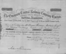 Die European Central Railway Company hatte ein Kapital von 700 000 Pfund Sterling in Form von Aktien aufgenommen, die in Stückelungen von 40 Pfund Sterling oder 1000 Schweizer Franken ausgegeben worden waren, was darauf hindeutet, dass man auf Schweizerische und französische Investoren hoffte. Das Aktienkapital hätte im Februar 2020 ungefähr eine Kaufkraft von 106 Mio. Euro entsprochen,[10] wobei aber nur etwa 20 % des Aktienkapitals einbezahlt worden war, weil die Investoren hofften, die Bahn weiter verkaufen zu können.[1]