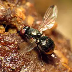 Die Maden entwickeln sich u. a. an Wurzeln von Zwiebeln, Kohl und anderem Gemüse.[2] Die Imagines saugen an Hundekot und ähnlichem.