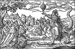 „Das Bild stellt die Hure Babylon dar, die auf der siebenköpfigen Bestie reitet. Heilige verbeugen sich in Anbetung vor ihr, während die Zehn Gebote zerbrochen vor ihren Füßen liegen. Das repräsentiert unsere Sicht und Interpretation von dem Gleichnis des Neuen Testaments, in dem die ‚Hure Babylon‘ ein Symbol der Rebellion und des Widerstandes gegen Gott ist.“