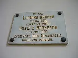 1905 stifteten Adela und Ludwik Bauer ein Waisenhaus für die Gemeinde (an der Słowackiego-Straße 4) und das Evangelische Haus der Barmherzigkeit (an der Słowackiego-Straße 4a), in dem alte Menschen und Behinderte[6] untergebracht wurden. 1908 stifteten sie auch ein Gebäude für die Pfarrschule. Sowohl die Pfarrschule als auch das Pflegeheim wurden nach Friedrich Wilhelm Cords benannt. Das Evangelische Haus der Barmherzigkeit war bis 1945 in Betrieb. Das Gebäude wird derzeit nicht genutzt.[3] Die Familie Bauer ist auch Stifter des 1897 erstellten geschmiedeten Zauns auf einem Ziegelfundament an der Brzeska-Straße.[6][7] In der Kirche befindet sich eine Gedenktafel zu Ehren von Ludwik und Adela Bauer.