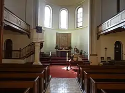 Der Altar steht in einer Nische von 20 Fuß Tiefe und fast gleicher Höhe mit der Decke des Kirchraums, ihr Fußboden aber ist um vier Stufen über dem des Schiffes erhöht, und der Altar selbst noch um zwei Stufen. Dieselbe ist dunkel gefärbt und zeigt an dem blauen Gewölbe goldene Sterne mit dem strahlenden Sonnenlicht; sie wird durch 3 Bogenfenster zum Teil von buntem Glas erhellt. Zu jeder Seite tritt man von diesem Chor in je eine geräumige Sakristei, welche beide auch eine Tür in das Schiff der Kirche haben und aus deren einer eine Stiege nach der westlichen Empore führt; von der Tür der anderen führt eine zierliche Treppe zur Kanzel. Steigt man die vier Stufen vom Chor hinab zum Schiff, so hat man zur Rechten die Kanzel frei auf einer Säule ruhend und zur Linken den Taufstein aus grauem Marmor, letzterer ein Geschenk an die Kirche. Der Raum vor dem Gestühl, in welchem beides sich befindet ist frei und bietet einen geräumigen Zugang zum Chor und Altar. Dieser letztere ist mit einem schönen Gemälde, die Auferstehung des Herrn darstellend, geschmückt, welches der rühmlich bekannte Maler und Litograph Loeillot de Mars, ein Glied der Gemeinde, gefertigt hat.