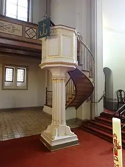 Der Kanzelkorb, der über eine Treppe neben der Tür zur Pfarrer-Sakristei erreicht wird, hat einen oktogonalen Grundriss. Er ruht auf einer dicken Säule, die mit acht dünnen Säulen verziert ist. Der Fuß ist annähernd quadratisch. Die gesamte Kanzel ist aus Holz gefertigt und weiß angestrichen und mit floralen Elementen verziert, die vergoldet wurden.