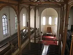 Das Dach der Kirche wird von 8 Säulen getragen, vier auf jeder Seite, welche den mittleren Hauptteil des ganzen Gebäudes gleichsam in ein Mittel- und zwei Seitenschiffe zerlegen. Bis zu ihnen reichen von jeder der langen Seiten her die Emporen, die an der Nordseite wieder miteinander durch eine dergleichen dritte verbunden sind. Hinter dieser letzteren befindet sich, an die Giebelmauer gelehnt und unter einem Rundbogen aufgestellt, die Orgel, ein Werk des Berliner Orgelbauers Dinse von 23 Registern.