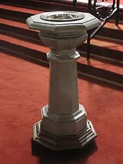 Der Taufstein ist sehr schlicht gehalten und besteht aus grauem Marmor. Die Grundform ist, wie bei der Kanzel, ein Achteck. Der Stein ist ausschließlich durch Profilierung verziert. Weitere Schmuckelemente sind nicht vorhanden. Der Taufstein befindet sich auf einem hölzernen Sockel und kann mittels im Fuß angebrachter Rollen verschoben werden. Für die Benutzung bei Taufhandlungen wird eine silberne Schale in die Vertiefung im Taufstein eingelegt.