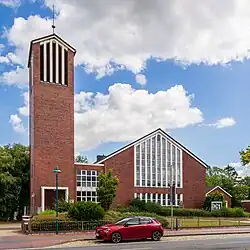 Die nicht-geostete Kirche ist ein Saalbau im Stil der klassischen Moderne, der von einem Satteldach abgeschlossen wird. An der westlichen Ecke ist ein hoher Glockenturm errichtet, der zugleich als Eingang dient und ein flaches Satteldach trägt. Ein kleiner flacher Anbau, der als Windfang und Treppenhaus zur Empore dient, verbindet den Glockenturm mit dem Kirchenschiff. Die Glocken wurden 1978 gegossen und wiegen 873 kg (in Fis gestimmt) und 518 kg (in A gestimmt).[8]