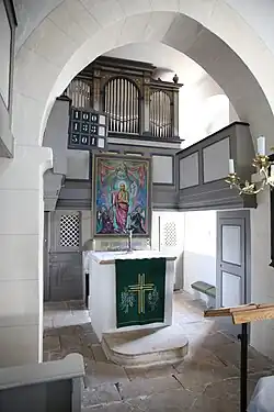 Die kleine Saalkirche hat Sandsteinwände und ein Satteldach mit Ziegeleindeckung. Am Übergang von Chor und Langhaus befindet sich ein achtseitiger, hölzerner Dachreiter mit einer verschieferten, welschen Haube.[3] Ein spitzbogiger Triumphbogen verbindet den eingezogenen, quadratischen Chorraum mit dem einachsigen Langhaus, in dem eine dreiseitige einstöckige Empore steht. Das Langhaus wird von einer hölzernen Flachdecke mit einem Längsunterzug in der Mitte überspannt. Aufgrund der Kanzel am rechten Pfeiler des Triumphbogens ist die hölzerne Empore nur auf etwa zwei Drittel der südlichen Wandlänge vorhanden und endet dort mit einer Balustersäule. Die hölzerne Kanzel hat einen polygonalen Korb mit Konsolenfries am Sockel und Zahnschnittfries am Obergesims. Die Felder sind mit ländlicher Malerei verziert. Ein Feld zeigt das Wappen der Herren von Lichtenstein. Hinter dem Altar befindet sich im Chorraum der ehemalige Herrschaftsstand mit ausgesägten Verschlussgittern und einer Brüstung mit Rahmenwerk.[2] Darüber ist auf einer Empore die Orgel angeordnet.