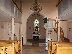 Das Ortsbild prägend steht die Kirche auf einer Anhöhe im Westen der Gemeinde. Es ist eine Chorturmkirche, deren Turm aus unverputzten Sandsteinquadern besteht und von einem schiefergedeckten, achteckigen Spitzhelm überdeckt ist. Der 3,6 Meter lange und 4,2 Meter breite Chor wird von einem Kreuzgewölbe überspannt, das aus spätgotischen, kehlprofilierten Rippen besteht und von einer Rosette mit Schlussstein abgeschlossen wird. An der Ostseite ist ein spitzbogiges und an der Südseite ein rechteckiges Fenster vorhanden, an der Nordseite führt eine spitzbogige Tür in die Sakristei. Ein spitzbogiger Triumphbogen verbindet den Altarraum mit dem 12,4 Meter langen und 7,8 Meter breiten Innenraum des Kirchenschiffes, der von einer Flachdecke überspannt und von einer umlaufenden, größtenteils zweigeschossigen Empore geprägt wird.[2] Die hölzerne Kanzel am südlichen Triumphbogenpfeiler, das Gestühl, das Lesepult und der Taufstein aus Sandstein mit sternförmigen Querschnitt sind neugotisch gestaltet. Die dreiachsigen Längsseiten des Langhauses sind durch neugotische Fenster und Strebepfeiler gegliedert. Der Westgiebel hat zwei neugotische Fenster und das Hauptportal mit einem schweifbogigen mit Fischmaasswerk gefüllten Aufsatz. Ein schiefergedecktes Satteldach bildet den oberen Abschluss.