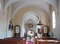 Die Innenausstattung nach dem Brand von 1839 (Kanzel 1844, Hochaltar und Seitenaltäre 1845) hatte der Fürther Kunstschreiner Johannes Paulus Haas angefertigt.[1] 1888/89 wurde die Innenausstattung im neuromanischen Stil umgestaltet. Ausgeführt wurden die Arbeiten von der Mayer’schen Königlichen Hof-Kunstanstalt München. Der Altar wurde in Eichenholz ausgeführt. Nach Auflösung des Simultaneums 1928 wurden die beiden Seitenaltäre und die Beichtstühle in die neue katholische Kirche verbracht. Wegen der Liturgiereform wurden sie aber dort nicht aufgestellt, sondern im Dachboden des Pfarrhofes verwahrt. Auch der Kreuzweg, gemalt von dem Neustädter Maler Thaddäus Rabusky, wurde entfernt und der katholischen Kirchengemeinde überlassen.