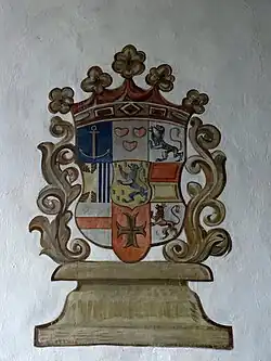 Der Innenraum über den Emporen wird von einer stuckierten Flachdecke abgeschlossen, die in den Ecken mit Putten verziert ist. Stucklisten an der Holztonne über dem Mittelraum imitieren ein Kreuzrippengewölbe.[16] Die Rippen enden in Medaillons, die wie Schlusssteine erscheinen und mit Früchten und Blättern verziert sind. Die Kreuzarme sind durch die Emporen abgetrennt und dienen als Treppenanlagen für die Emporen. Die dreiseitig umlaufende, U-förmige Empore ruht an den Langseiten auf toskanischen Säulen mit hohen, viereckigen Schäften und quaderförmigen Kapitellen. Oberhalb der Empore werden die Säulen zum Abstützen der Decke fortgeführt. Die Brüstungen sind mit Festons bemalt, die Bärenklau-Ranken zeigen. Die gräflichen Wappen von Wilhelm Moritz und seiner Frau Prinzessin Magdalene Sophie von Hessen-Homburg sind an der Ostwand der Kirche aufgemalt und flankieren die Orgel. Über der Empore an der Westwand sind der Bibelvers aus Ps 26,8 und die Inschrift „Erbaut im Jahre des Herrn 1703“ gemalt.[22]