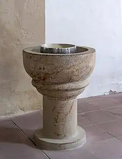 Der romanische Taufstein stammt aus der Kirche in Elbrinxen.[5]