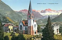 In Bozen bzw. im benachbarten Kurort Gries wurde für den Bau 1903 ein Villengrundstück erworben. Der evangelische Kirchenbauverein stieß aber auf Widerstand der Grieser Weinbauern, der zu einer Verweigerung der Baugenehmigung durch die Gemeinde Gries führte. Erst mit Hilfe ihres Rechtsanwaltes, des Bozner Bürgermeisters Julius Perathoner, konnte der Kirchenbauverein 1905 vor dem Verwaltungsgerichtshof sein Recht durchsetzen.[3]