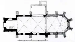 Der vorgesetzte spätromanische Westturm, der durch Lisenen und Rundbogenfriese gegliedert ist, sowie das zweijochige einschiffige Langhaus entstammen der zweiten Hälfte des 12. Jahrhunderts. Bei den Wiederherstellungsarbeiten des 16. Jahrhunderts wurde das Langhaus mit Strebepfeilern verstärkt und innen über romanischen Wandvorlagen ein Kreuzrippengewölbe eingezogen. Zu Anfang des 17. Jahrhunderts wurde der Turm um ein viertes Geschoss erhöht. 1956 wurden ein nördliches Seitenschiff und eine Sakristei angebaut.