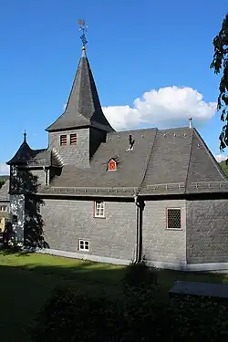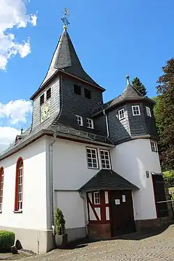 Die Kapelle ist als Fachwerkbau im Ortszentrum auf einer kleinen Erhebung errichtet.[6] Sie ist 4,50 Meter hoch, 5,00 Meter breit und 11,50 Meter lang. Sie ist nicht geostet, sondern parallel zur östlichen verlaufenden Hauptstraße nach Süden ausgerichtet. Die West- und Südseite sowie das Dach sind verschiefert, während die Ost- und Nordseite des Gebäudes weiß verputzt sind.[7] Das verschindelte Satteldach ist mit zwei kleinen Gauben bestückt. Dem Dach ist im Norden ein verschieferter Dachreiter aufgesetzt, der an jeder Seite zwei viereckige Schallöffnungen hat. An der Ostseite ist das Zifferblatt der Turmuhr angebracht. Über dem kubusförmigen Schaft erhebt sich ein oktogonaler Spitzhelm. Er wird von einem Turmknauf, Kreuz, Windrichtungsanzeiger und einem Wetterhahn bekrönt.
