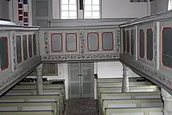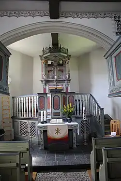 Im Inneren öffnet ein Triumphbogen den Chor zum Schiff. Die Balkendecke im Schiff wird von einem Längsunterzug getragen.[1] Im oberen Abschluss sind die vier Wände des Schiffes mit einem grünen Vorhang aus Blumen mit roten Blüten bemalt. Die hölzerne Kirchenausstattung ist einheitlich barock gestaltet, aber nach dem Brand von 1967 teilweise erneuert. Der Mittelgang ist mit Flusskieseln im Fischgrätenmuster gelegt, unterhalb des Kirchengestühls liegt ein Dielenboden. Die schlichten Kirchenbänke haben geschwungene Wangen. Eine dreiseitige umlaufende Empore wird von gegliederten, bauchigen Säulen in hellgrau-hellblau marmorierter Fassung gestützt. Die Brüstungen haben viereckige kassettierte Füllungen mit grauer Marmorierung und rot gefassten Profilen. Die jeweils zwei, drei oder vier Füllungen werden durch Lisenen gegliedert, das geschnitztes Rankenwerk mit roten Blüten ausfweist. Unterhalb der Füllungen ist ein durchgehendes Fries aus Blattwerk angebracht.