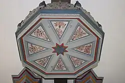 Der Kanzelkorb ist vorkragend in die Orgelbrüstung integriert und wird durch Säulen aus geschnitztem Blattwerk gegliedert. Die kassettierten Füllungen im oberen Bereich sind rot marmoriert bemalt und habe blaue Profile, im Sockelbereich haben die querrechteckigen Füllungen geschnitztes Blattwerk. Der achtseitige Schalldeckel der Kanzel wurde 1783 gestiftet,[6] wie auf dem Kranz zu lesen ist: „Anna Catharina Bastin Wittwe ANNO 1783“. Die acht dreieckigen Felder an der Unterseiten sind mit Blumenornamenten bemalt, während der Deckel von durchbrochenem Rankenwerk mit kleinen Spitzen bekrönt wird. Das Podest im Chorraum für Kanzel und Orgel hat im unteren Bereich durchbrochenes Rautenwerk. Seitlich des Kanzelkorbes besteht die Brüstung aus geschnitzten Brettern. Zu den Vasa sacra gehört ein Abendmahlsbecher von 1642.