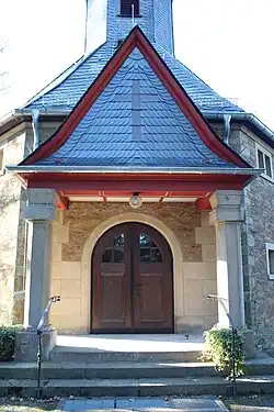Die Saalkirche ist nicht geostet, sondern nach Südwesten ausgerichtet. Sie wurde am südlichen Ortsrand aus unverputztem Bruchsteinmauerwerk mit Eckquaderung über einem Sockel errichtet. Die Ecken des Kirchenschiffs sind im Osten abgeschrägt. Dem großen Walmdach sind an jeder Seite drei kleine Dachgauben mit Dreiecksgiebeln aufgesetzt. Das Gotteshaus wird durch ein rundbogiges Ostportal unter einem verschieferten Vorbau erschlossen, der von zwei achtseitigen Säulen aus Kunststein getragen wird. Das Schiff wird an den Langseiten durch je zwei große Rundbogenfenster und östlich durch ein niedriges Drillingsfenster belichtet, über dem ein kleines Rundfenster eingelassen ist. Der Chor ist gegenüber dem Schiff niedriger und eingezogen. Er hat nur ein kleines Rundbogenfenster im Westen. Im Süden des Chors schließt sich die kleine Sakristei mit einem kleinen quadratischen Fenster im Süden unter einem Schleppdach an. Die Glasmalereianstalt Ferdinand Müller fertigte das Bleiglasfenster im Chor,[2] das den Auferstandenen zeigt. Die übrigen Fenster weisen Sprossengliederung auf. Der achtseitige Dachreiter mit Zwiebelhaube beherbergt ein Dreiergeläut.