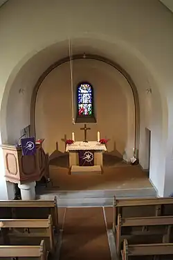 Ein Rundbogen öffnet den um zwei Stufen erhöhten Chor zum Schiff. Der massiv aufgemauerte Blockaltar hat eine überstehende Mensaplatte aus Stein. Die polygonale hölzerne Kanzel am südlichen Bogen weist in den Kanzelfeldern achteckige Füllungen auf und schließt oben mit einem profilierten Kranzgesims ab. Das holzsichtige bauzeitliche Kirchengestühl mit roten Profilen lässt einen Mittelgang frei.
