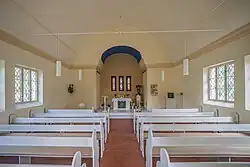 Der Altar, die Kanzel sowie die Fünte sind aus der Bauzeit und schlicht gestaltet. Das Kreuz aus Bronze schuf der Künstler Paul Gnekow im Jahr 2008. In der nordwestlichen Ecke der Kirche hängt ein Leuchterengel aus Bronze. Er ist eine Kopie des hölzernen Lübecker Leuchterengels, der im Zweiten Weltkrieg verloren ging. Auf einer kleinen Empore steht eine Orgel der Firma Schuke aus Potsdam. Das Instrument verfügt über ein Manual.