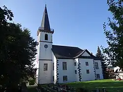 Vor der Kirche erinnert ein Denkmal von 1922 an die Gefallenen des Ersten Weltkriegs.[13] Auf einem Betonquader, der die Namen der Verstorbenen trägt, kniet eine Frau mit einem kleinen Kind und einem Ehrenkranz.