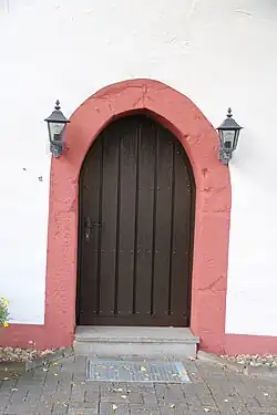 Das Gebäude wird durch ein spitzbogiges Südportal nahe der Westecke erschlossen und durch Stichbogenfenster im Süden sowie ein Stichbogenfenster im Osten belichtet. Die später vergrößerten Fenster haben eichene Holzzargen. Ein kleines rechteckiges, gekehltes Schlitzfenster findet sich in der Westseite und ein kleines, hoch sitzendes Rechteckfenster mit Fase rechts oberhalb des Südportals.[1] Die Nordseite hat ein schmales spitzbogiges Fenster aus Lungstein mit Hohlkehle (1,22 × 0,54 Meter), das aus der Erbauungszeit stammt.[9] Das ursprüngliche Maßwerk ist nicht erhalten. Dem steilen Satteldach ist ein sechsseitiger Dachreiter mit Spitzhelm aufgesetzt, der an die mittelalterliche Formensprache anknüpft. Er beherbergt eine Glocke, die 1633 gegossen wurde und folgende Inschrift trägt: „GEORG SCHERNBERG BEIN GOS MICH IN MARPURG 1633“.[10] Vermutlich stammt die Glocke aus einer anderen Kirche, da der Dachreiter erst 1752 aufgesetzt wurde.[11]