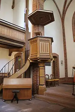 Ebenfalls bauzeitlich sind der holzsichtige, polygonale Kanzelkorb auf einem sechsseitigen, gegliederten Fuß und der steinerne Altar.[11] Der sechsseitige Schalldeckel ist passend zum Kanzelkorb gefertigt. Die Altarmensa ruht hinten auf einer massiven Rückwand und vorne auf zwei wuchtigen Steinsäulen mit vergoldeten Profilen. Am Altar ist ein modernes schlichtes Holzkreuz angebracht. Das Kirchengestühl bildet im Mittelschiff einen großen Block aus hölzernen Querbänken, während unterhalb der Emporen Längsbänke aufgestellt sind.[11]