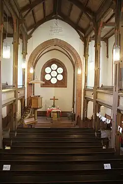 Durch die eingebauten dreiseitig umlaufenden Emporen wird der Eindruck eines dreischiffigen Innenraums erweckt.[2] Hohe Holzpfosten, die die Decke stützen und in Bügen auslaufen, beziehen die Emporen ein. Dienste springen aus der Wand vor und stützen die Decken der schmalen Seitenschiffe. Während oberhalb der Emporen eine Holzbalkendecke eingezogen ist, ist der mittlere Bereich als offener Dachstuhl gestaltet.[1] Der Boden ist mit roten Sandsteinplatten belegt. Über dem Chorbogen und unter dem Christusmonogramm ist der Bibelvers aus 1 Kor 3,11 aufgemalt.