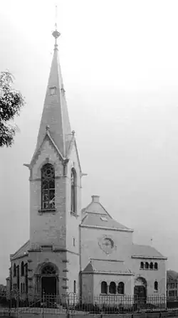 Im Jahr 1902 begann man mit dem Bau einer neoromanischen Hallenkirche mit gangartigen angedeuteten Seitenschiffen und übereck gestelltem Turm mit hohem Spitzhelm[10] durch den aus Baden-Baden und in St. Johann an der Saar ansässigen[11] Architekten Karl Heinrich Brugger (1858–1931).[12] In der Urkunde zur Grundsteinlegung am 1. August 1902 heißt es:[13]