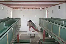 Der Innenraum wird von einer eingezogenen Flachdecke abgeschlossen, deren rot bemalte Balken sich von den weiß verputzten Gefachen abheben. Im Westen ist ein kleines Stück als Eingangsbereich und für den Emporenaufgang abgetrennt. Die Kirchenausstattung ist entsprechend reformierter Tradition schlicht gehalten. Die hölzernen Inventarstücke sind einheitlich in Grüntönen und in Rot gefasst. Die dreiseitig umlaufende Empore ruht auf viereckigen Pfosten mit Bügen. Sie reicht relativ weit an den Mittelgang heran, endet aber vor dem Chor. Die Brüstungen haben schlichte querrechteckige, kassettierte Füllungen. Das hölzerne Kirchengestühl steht auf einem Dielenboden und lässt einen Mittelgang frei.