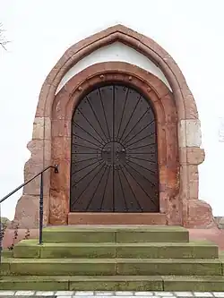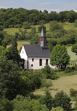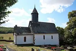 Die geostete Kirche ist leicht erhöht auf einem Hügel außerhalb und östlich des Dorfes errichtet. Der kleine Saalbau aus Bruchsteinmauerwerk auf rechteckigem Grundriss ist weiß verputzt. Die Grundmauern des Schiffs gehen auf das 13. Jahrhundert zurück und wurden 1631 nicht, wie vermutet, erweitert.[8] Die Eckquaderung, der Sockel und die Gewände aus rotem Sandstein sind vom Verputz ausgespart. Den Ostabschluss bildet ein eingezogener und niedrigerer Rechteckchor aus der ersten Hälfte des 13. Jahrhunderts. Das Gelände ist von einer teilweise erhaltenen Friedhofsmauer eingefriedet, die auf den wehrhaften Charakter der Kirche hinweist.[2]