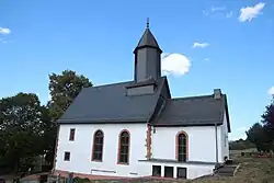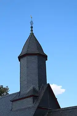 Dem verschieferten Satteldach des Schiffs ist im Osten ein oktogonaler Haubendachreiter des 17. Jahrhunderts aufgesetzt, der vollständig verschiefert ist und sich aus einer quadratischen Basis entwickelt.[8] In der Glockenstube sind kleine rechteckige Schallöffnungen eingelassen. Sie beherbergt ein Dreiergeläut, eine Glocke von Johannes Henschel, die während der Amtszeit von Pastor Ludwig Christoph Horn (1695–1730) gegossen wurde, und zwei Rincker-Glocken von 1952.[2] Die Haube wird von einem Wetterhahn mit Turmknauf und Kreuz bekrönt. Das Satteldach des Chors und die östliche Giebelseite des Schiffs sind ebenfalls verschiefert. Das Schiff wird an der Nordseite durch zwei schmale Schlitzfenster und an der östlichen Südseite durch zwei große Rundbogenfenster aus barocker Zeit und an der westlichen Südseite durch ein kleines querrechteckiges und ein hochrechteckiges Fenster belichtet. Der Chor wird durch ein großes rundbogiges Südfenster und zwei schmale Fenster im Osten und Norden mit Licht versorgt. Die zwei schmalen Fenster im Norden und das östliche Chorfenster sind konisch und mit Fase und stammen noch aus romanischer Zeit, das Nordfenster des Chors hat bereits einen stumpfen Spitzbogen.[1] Über dem rundbogigen Westportal mit spitzbogiger Blende und Krabben[2] ist ein Rundfenster, im Giebeldreieck eine kreuzförmige Öffnung und in der Spitze ein Dreiecksgiebel aus rotem Sandstein als Spolie eingelassen.