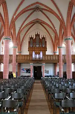Das Innere wird durch Säulen, die ein Deckengewölbe tragen, in drei Schiffe, ein Mittelschiff und zwei Seitenschiffe, untergliedert. Der Altar, auf den ein Mittelgang vom Hauptportal im Westturm her hinführt, befindet sich in einer um drei Stufen erhöhten und ebenfalls gewölbten Chorapsis. Vor der nördlichen Seite des Triumphbogens, der Chor von Langhaus trennt, steht eine Kanzel. Im Westteil des Langhauses befindet sich eine Empore, auf der die Orgel aufgestellt ist. Die Möglichkeit zum Einbau von weiteren Emporen entlang der Seitenwände des Langhauses war bei der Planung des Baus berücksichtigt worden, wurde aber nicht ausgeführt.[4]