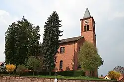 Die nach Plänen von Heinrich Hübsch errichtete Hallenkirche aus Quadermauerwerk ersetzte 1836 einen Vorgängerbau. Sie besteht aus dem aufgrund der Emporen im Inneren zweigeschossig gegliederten Langhaus und dem mit einem Pyramidendach bedeckten Kirchturm auf quadratischem Grundriss im Osten, dessen oberstes Geschoss die Turmuhr und hinter den als Biforien gestalteten Klangarkaden den Glockenstuhl mit drei Kirchenglocken beherbergt.