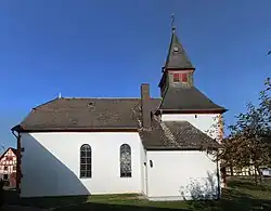 Der niedrige Turm auf quadratischem Grundriss reicht in seinem unteren Teil nur zwei Meter über das Schiff hinaus.[1] Er hat an der Nordseite die ursprünglichen spitzbogigen Schlitzfenster (0,18 Meter × 1,20 Meter), im Osten und Süden spätgotische Fenster ohne Maßwerk. Das bunt bemalte Bleiglasfenster in der Ostwand, das der Künstler Beiler aus Heidelberg im Jahr 1902 bemalte, zeigt den auferstandenen Christus. Der Chorraum hat seit gotischer Zeit ein Kreuzgewölbe mit gekehlten Rippen, die auf Konsolen ruhen. Der runde Schlussstein ist mit einer Rose belegt, Symbol für Maria.