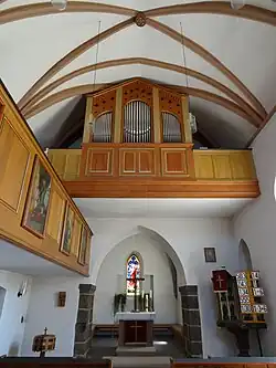 Im Jahr 1703 erhielt die Kirche eine barocke Orgel, die wahrscheinlich von Florentinus Wang aus Hadamer gebaut wurde. Das Instrument verfügte über acht Register auf einem Manual und über kein Pedal. Johann Georg Förster baute 1880 auf der neu errichteten Empore ein einmanualiges Werk mit acht Registern und mechanischen Kegelladen. Eine größere Reparatur erfolgte 1938 durch Förster & Nicolaus, die 1996 die Prospektpfeifen aus Zink durch Zinnpfeifen ersetzten und das Gehäuse mit Bierlasur neu fassten.[16] Der Prospekt wird durch Lisenen in drei Pfeifenfelder gegliedert. Die Disposition lautet wie folgt:[17]
