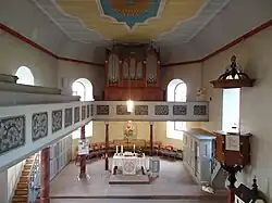Der Innenraum wird von einer Flachdecke abgeschlossen, die an den Langseiten breite Kehlen hat. In die Kirche ist eine dreiseitig umlaufende Empore eingebaut, die von marmoriert bemalten Rundsäulen gestützt wird. Die Füllungen sind mit Rankenornamenten bemalt. Die Ostempore dient als Aufstellungsort der Orgel und wurde später ergänzt.[1] Zwei Längsunterzüge im westlichen Deckenbereich, die das Gewicht des Dachreiters auffangen, ruhen auf zwei Rundsäulen, die oberhalb der Westempore die Emporenstützen fortsetzen. Zentral in der Decke wird das Auge der Vorsehung von einem Dreieck, dem Gottesnamen JEHOVA und einem Strahlenkranz umgeben. Die vergoldete Darstellung auf blauem Hintergrund wird von einem Polygon aus Stuckprofil gerahmt, das wiederum von einem gelben, noch komplexeren Polygon umschlossen wird.