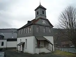 Die erste Kirche wurde 1561 errichtet. 1732 wurde die alte Holzkirche niedergerissen und an derselben Stelle eine massive Kirche gebaut. Am 23. Juni 1827 brannten im Ort viele Gebäude nieder, auch die Kirche war betroffen, wurde aber wieder aufgebaut. Das wieder aufgebaute Gebäude gehörte halb der Gemeinde, halb der Kirchengemeinde. Das Erdgeschoss diente als Kirche. Im Obergeschoss war zunächst die Schule untergebracht, später dann das Rathaus. Erst 1973 wurde dieser Zustand aufgehoben und das Gebäude ist im alleinigen Eigentum der Kirchengemeinde.