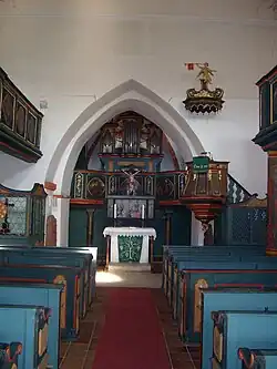 Im Zuge einer Instandsetzung durch Förster & Nicolaus 1953 wurde die Gambe 8′ durch ein Quintatön 8′ ersetzt. 1977 folgte eine Restaurierung durch dieselbe Firma, die den Principal 4′ erneuerte. Das Instrument verfügt über 13 Register, die sich auf einem Manual und Pedal verteilen. Neben den beiden ausgetauschten Registern wurde der vierte Chor der Mixtur erneuert. Das übrige Pfeifenwerk ist alt. Die Disposition lautet wie folgt:[20]