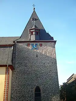 Erhalten ist der mächtige Chorturm an der Ostseite auf quadratischem Grundriss. Die spätgotischen Schlüsselscharten und die kleinen Fenster weisen auf den Charakter als Wehrturm.[11] Die ursprüngliche Südtür wurde 1812 vermauert. Das schmale Spitzbogenfenster an der Nordseite, die kleinen Fenster und die beiden Schießscharten unterhalb der Traufe stammen aus der Erbauungszeit. Im 15. Jahrhundert wurde das Fenster an der Ostseite eingebrochen, dessen Maßwerk nur noch in Resten erhalten ist. Darunter ist ein rechteckiges Portal mit einem Gewände aus rotem Sandstein eingelassen. In der Südseite ist ein Portal vermauert, das ursprünglich wahrscheinlich in eine angebaute Sakristei führte.[12] In der Nische außen ist seit 1975/1976 ein Grabstein aus rotem Sandstein aufgestellt. Über dem gemauerten Turmschaft erhebt sich der verschieferte Helmaufbau, der eine Höhe von 30,30 Meter erreicht. Der spitze Pyramidenhelm wird von Turmknauf, geschmiedetem Kreuz und Wetterhahn bekrönt. Über der Traufe wurden an der Nord-, Ost- und Südseite Dachgauben mit kleinen Schalllöchern für das Geläut aufgesetzt, sogenannte Wichhäuschen, wohl mit der Erhebung zur Pfarrei im 15. Jahrhundert.[11] An den drei freien Seiten unterhalb der Traufen sind die Ziffernblätter der Turmuhren angebracht, die elektrisch gesteuert werden. Das alte mechanische Uhrwerk ist noch im Turm erhalten.[13] Ein Spitzbogen öffnet die Chorhalle zum Schiff. Die Turmhalle hat ein Kreuzgratgewölbe, dessen Rippen auf Spitzkonsolen ruhen. Der Schlussstein ist mit einer stilisierten Rose, einem Mariensymbol, belegt.[14]