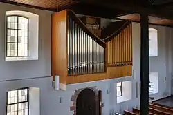 Die Orgel wurde 1969 von Peter Vier erbaut und hängt an der Nordwand über dem Haupteingang. Das Instrument arbeitet mit elektrischer Schleiflade und Traktur und verfügt über zwei Manuale, ein Pedal und 19 Register. Der dazugehörige Spieltisch befindet sich auf der Westempore, auf der sich auch weitere Sitzplätze für Kirchgänger befinden.[9]