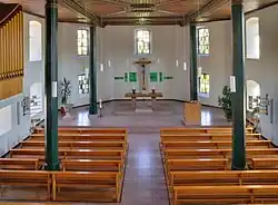 Das Kircheninnere ist mit einer flachen Holzdecke eingezogen. Der Haupteingang erfolgt über die Turmhalle. Im Altarraum befinden sich Kruzifix und Taufstein, die aus der Erbauungszeit erhalten geblieben sind.[7] Altar und Kanzel stammen aus dem Jahr 1910.[6]