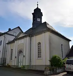 Eine kleine Kapelle wurde aufgrund ihres schlechten Zustandes 1775 niedergelegt. Als Nachfolger wurde 1777 eine quergelagerte, frühklassizistische Saalkirche nach einem Entwurf von Friedrich Ludwig Gunckel[1] gebaut. Am 26. Oktober 1777 wurde die Kirche eingeweiht. Die mit Pilastern gegliederte Fassade hat zwei Bogenfenster und in der Mitte einen Risalit, der mit einem Giebeldreieck bekrönt ist. In ihm befindet sich das Portal. Aus dem Walmdach erhebt sich ein sechseckiger, schiefergedeckter Dachreiter, der die Turmuhr und den Glockenstuhl mit zwei Kirchenglocken beherbergt. Auf ihm sitzt eine bauchige Haube.