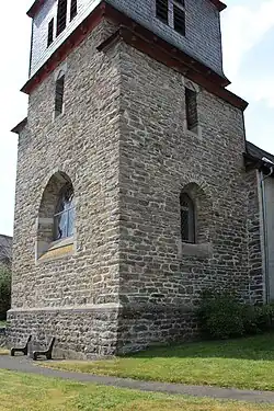 Der ursprünglich wehrhafte Kirchturm auf quadratischem Grundriss ist ungegliedert. Die Turmhalle mit ihrem Kreuzgewölbe wird an den drei freistehenden Seiten durch Fenster mit stumpfem Spitzbogen belichtet, die seit den Erneuerungsmaßnahmen von 1899 geweitet sind und Fensterstürze und schräge Sohlbänke aus hellem Werkstein erhalten haben. Im Obergeschoss sind drei Schlitzfenster eingelassen, deren Fensterstürze Kleeblatt-Nischen haben. Unterhalb der Traufe springt im Süden und Norden das Mauerwerk etwas zurück und wird dort von einem kleinen Schieferdach bedeckt. Dem massiv aufgemauerten Turmschaft ist ein kubusförmiges, verschiefertes Obergeschoss in Fachwerkweise aufgesetzt, über dem sich der Turmhelm erhebt. Der vierseitige Spitzhelm mit abgeflachten Ecken trägt die vier Zifferblätter der Turmuhr unter einem Dreiecksgiebel. Er erreicht eine Höhe von 28 Metern und wird von einem Turmknauf, einem verzierten Kreuz und einem Wetterhahn bekrönt. Ein polygonaler Treppenturm des 19. Jahrhunderts an der Südseite zwischen Turm und Schiff hat Schlitzfenster in der Art des Turmobergeschosses und ein verschiefertes Obergeschoss, dem ein oktogonaler Spitzhelm aufgesetzt ist.
