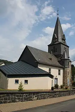 Das verputzte Kirchenschiff des 17. Jahrhunderts auf rechteckigem Grundriss wird von einem verschieferten Satteldach bedeckt. Es wird im Süden durch zwei kleine hochsitzende Rechteckfenster belichtet und durch ein hochrechteckiges Südportal erschlossen. Die westliche Giebelseite ist verschiefert und die nördliche Seite fensterlos. Um das westliche Ende sind moderne, niedrige Gemeinderäume von 1973 herumgebaut.