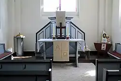 Die polygonale hölzerne Kanzel ist an der Ostseite des Chors aufgestellt und hat eine zweiläufige Treppe. Im Schiff lässt das hölzerne Kirchengestühl einen Mittelgang frei.