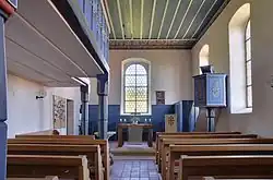 Der Innenraum ist mit einer flachen Holzdecke überspannt. Im kleinen Kirchenraum ist eine L-förmige Empore angebracht, auf deren Nordseite die Orgel aufgestellt ist. Decke und Holzempore sind mit einer reichen Ornamentik bemalt. Chor und Langhaus sind über einen Triumphbogen miteinander verbunden. Rechts vom Bogen steht eine Kanzel, die auf einer achteckigen Säule ruht. Im Chor steht ein schlichter Altartisch, links davon befindet sich ein alter Taufstein mit neuer Zinnschale.