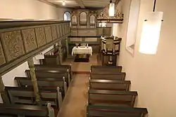 Die Kirchenausstattung ist entsprechend reformierter Tradition schlicht gehalten.[13] Sie wird von Grüntönen beherrscht. Die Flachdecke wird von einem Längsunterzug gestützt.