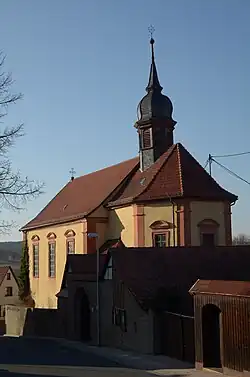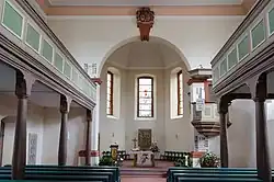 Der Chor der Kirche mit dem Altar liegt im Osten. Über dem Chor befindet sich der achteckige Dachreiter mit Zwiebeldach. Das Langhaus besitzt eine dreiseitig umlaufende Empore. Die Kanzel, farblich genauso gestaltet wie die Brüstung der Empore, ist rechts neben dem Chorbogen angebracht. Die Orgel steht auf dem westlichen Teil der Empore. Über dem Chorbogen sieht man das Allianzwappen des Johann Georg von Schenck zu Schweinsberg und der Anna Helena Sophia von Schenk, geborene von Wallenstein. In der Kirche befinden sich mehrere Grabmäler, unter anderem das von Konrad von und zu Thann † 1681, ein Werk von Jakob Faulstig aus Hammelburg.