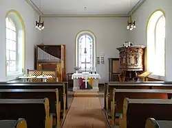 Das schlichte, hölzerne Kirchengestühl hat geschwungene Wangen und lässt einen Mittelgang frei. Der Blockaltar mit Sockel und Platte ist weiß-marmoriert. Dahinter ist unter dem Ostfenster ein Wappenstein derer von Eppstein eingelassen (nach 1418), der aus der Vorgängerkirche übernommen wurde.[5]